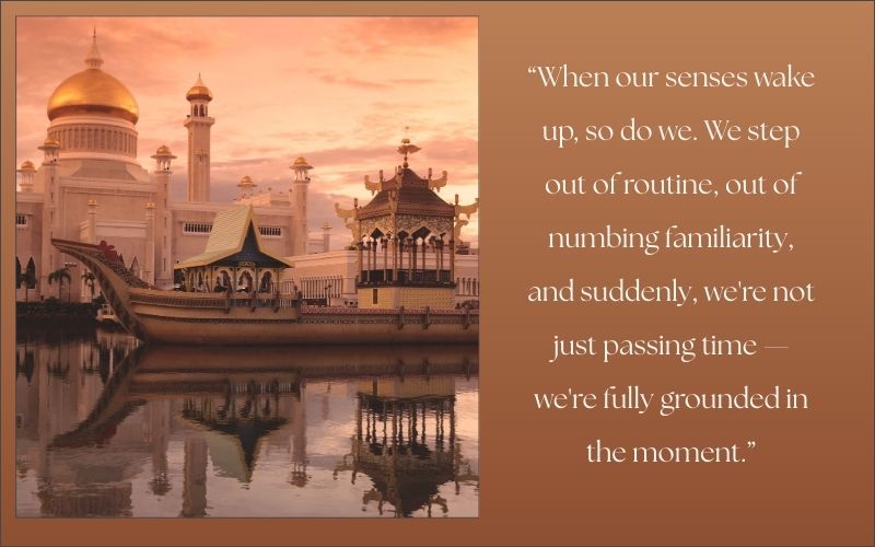 It reawakens the senses — the aroma of saffron in a Moroccan market, the hush of fresh snowfall in the Alps, the tang of salt in a Greek sea breeze. When our senses come alive, so do we. We step out of routine and into presence.